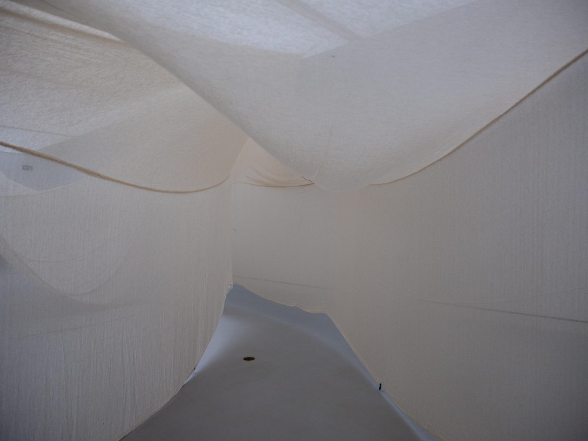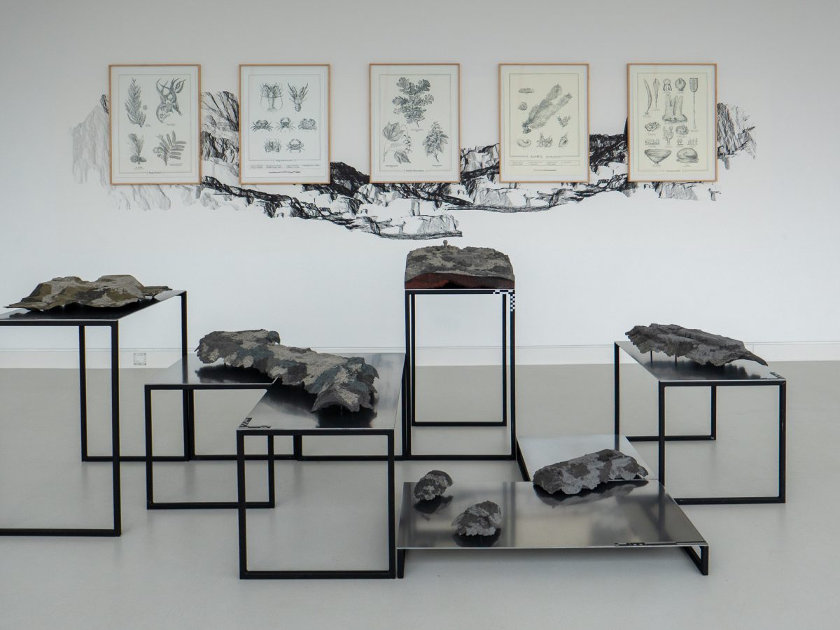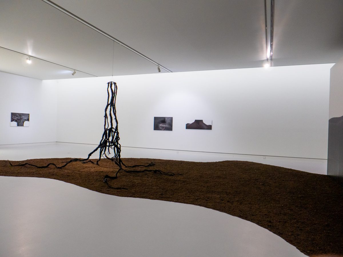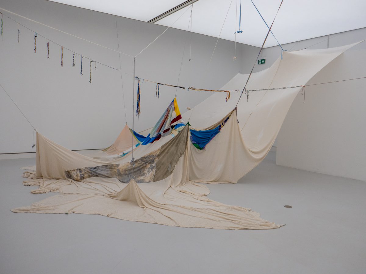 Die Zugänge sind so unterschiedlich wie die Künstlerinnen und Künstler selbst. Anca Benera und Arnold Estefán kartieren in „Debrisphere“ die unsichtbaren Narben militärischer Landnutzung, filigrane Zeichnungen und Modelle aus Korallensand und Vulkanasche, die zeigen, wie Krieg sich in Böden und Topografien einschreibt. Binta Diaw lässt in ihrer Installation „Reeni Yakar – les racines de l’espoir“ Wurzeln aus geflochtenem Kunsthaar und Eisendrähten aus der Erde wachsen: ein Bild für Verwurzelung, Entwurzelung und koloniale Verflechtungen. Sarah Burger sammelt in „All the Landscapes I’ve ever seen“ Erinnerungsbilder von Landschaften – subjektive Kartografien dessen, was bleibt. Reto Pulfer wiederum lädt mit begehbaren Stoffarchitekturen ein, selbst Teil einer Landschaft zu werden.